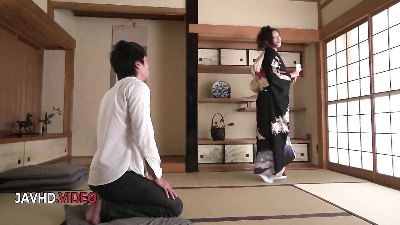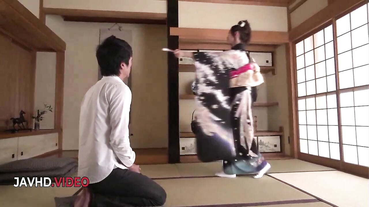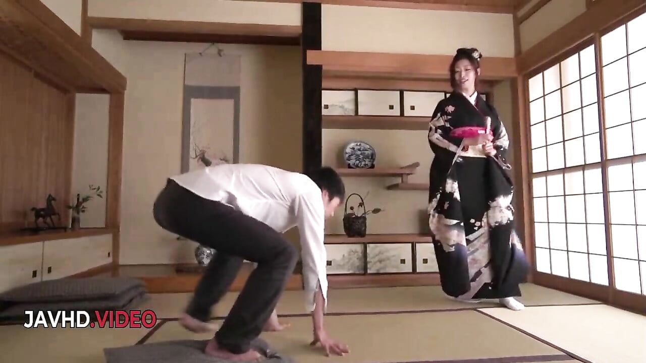 Ein junger Mann versucht, mit einer reifen, großbusigen Geisha Sex zu haben.